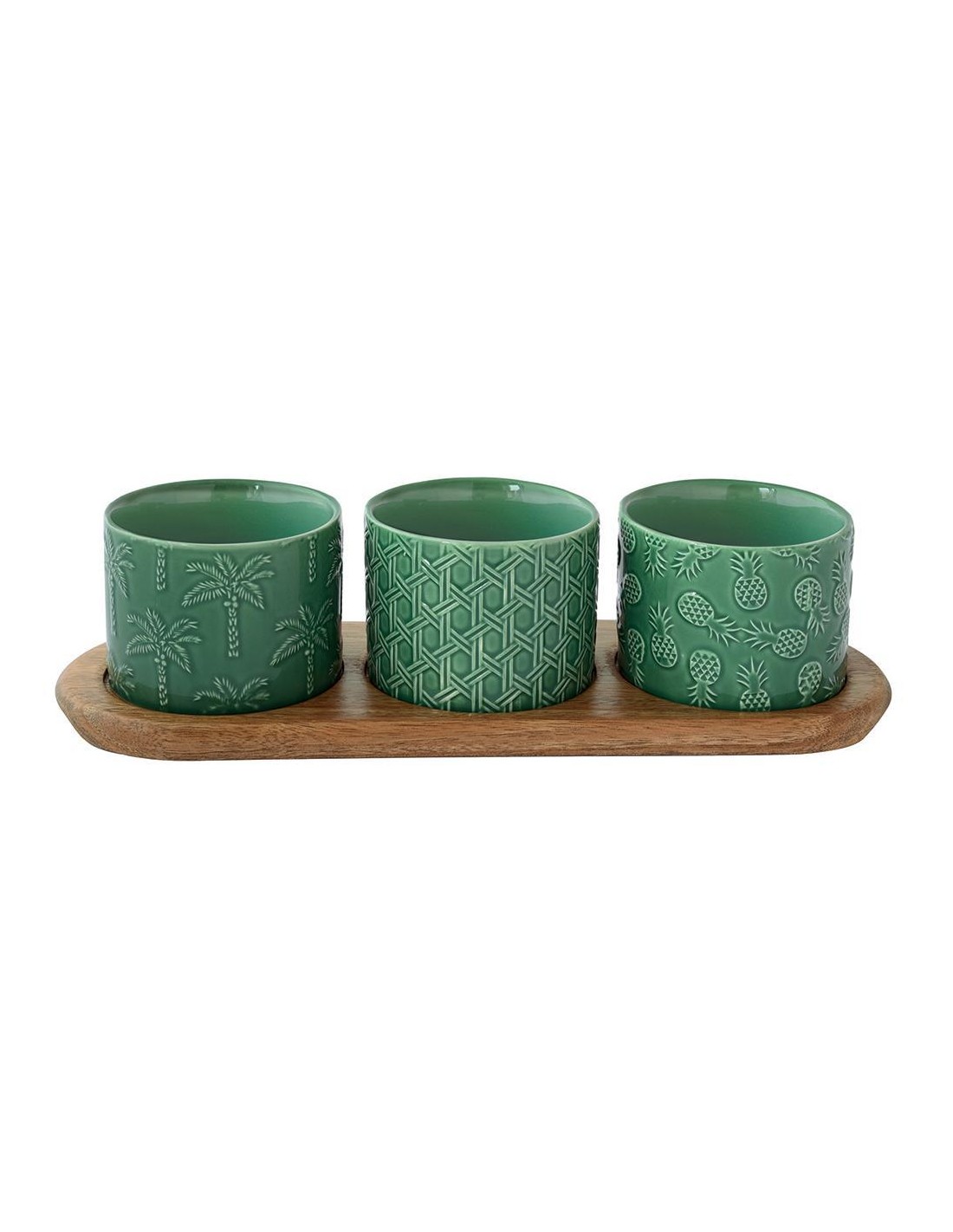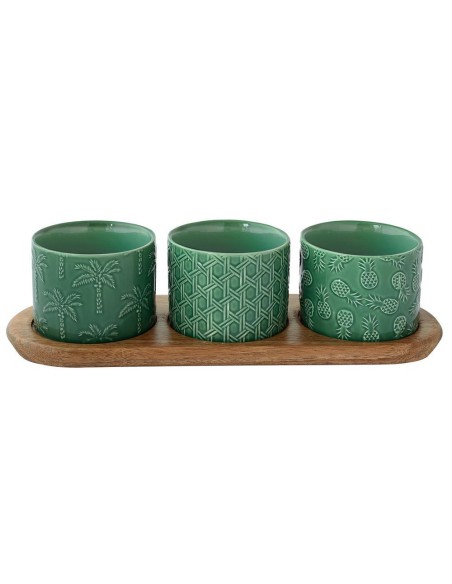 Set aperitivo Tropicana , firmato Easy Life, con 3 ciotoline in porcellana e vassoio in acacia, scatolato. Ogni ciotolina ha un decoro diverso, da coordinare con piatto e ciotola a forma di ananas.