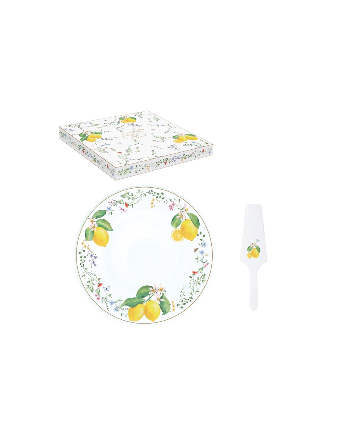 Piatto torta con paletta in finissima porcellana della collezione Fleurs et citrons, in colour box. Il piatto è decorato con una cornice di fiori di campo tra grappoli di limoni dai colori vivaci, tipici della macchia mediterranea.
