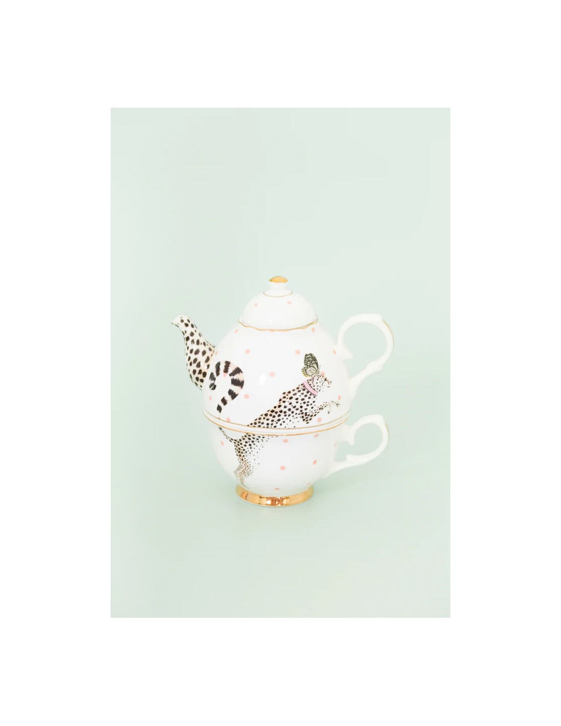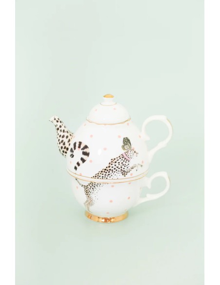 Tea for one firmata Yvonne Ellen in finissima porcellana Bone China, composta da teiera e tazza con piattino. Il design è il classico decoro ispirato al mondo della savana, al centro un ghepardo su un fondo bianco con pois rosa, elegante ed originale .