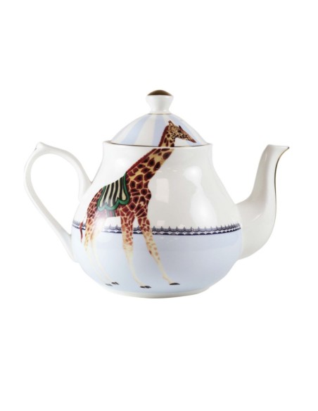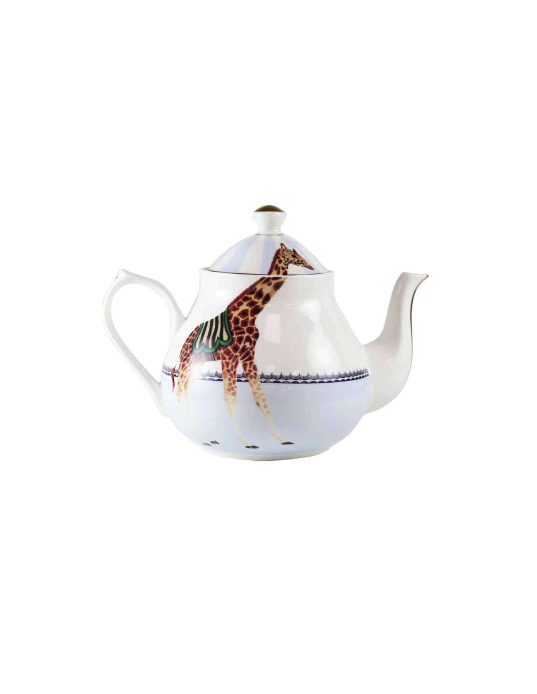 Tea Pot Carnival firmata Yvonne Ellene in finissima porcellana Bone Chine.Il design è il classico decoro ispirato al mondo della savana, al centro una giraffa che continua sul tappo della Tea Pot, i colori pastello, il celeste polvere, fanno da sfondo ai colori forti della giraffa.