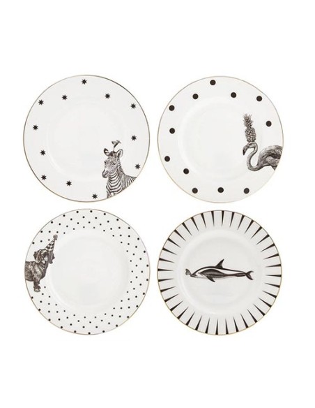 è in bianco e nero: ogni piattino presenta un soggetto diverso, fenicottero, zebra, cane e delfino. Per la loro eleganza ed originalità ,possono essere usati sia come piatto dolce , sia come oggetto d'arredamento.