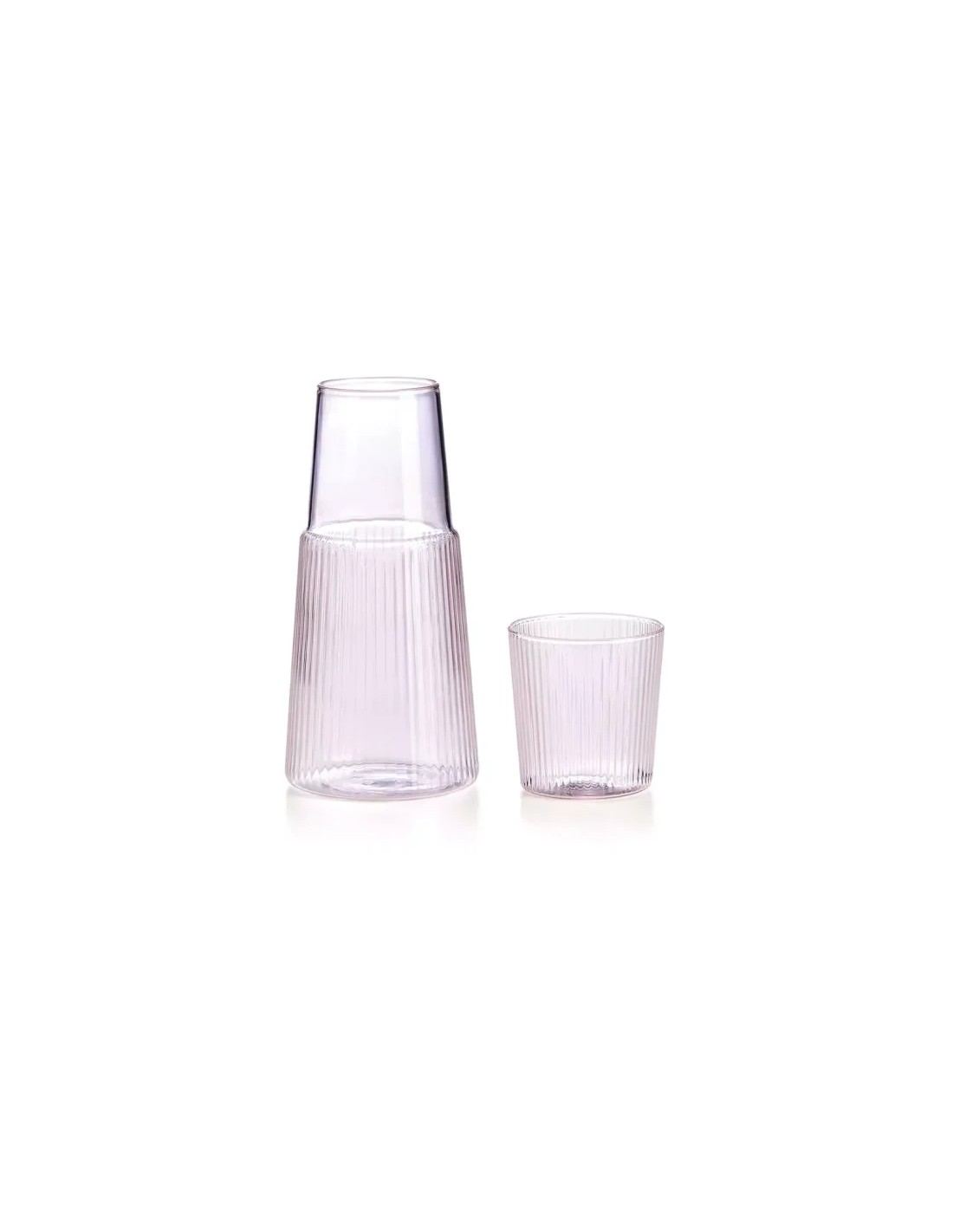 Caraffa Narciso plissè con bicchiere che funge anche da coperchio, in vetro borosilicato, nei colori blu, rosa e verde. Utile da portare in ufficio o tenere sul comodino per la notte.