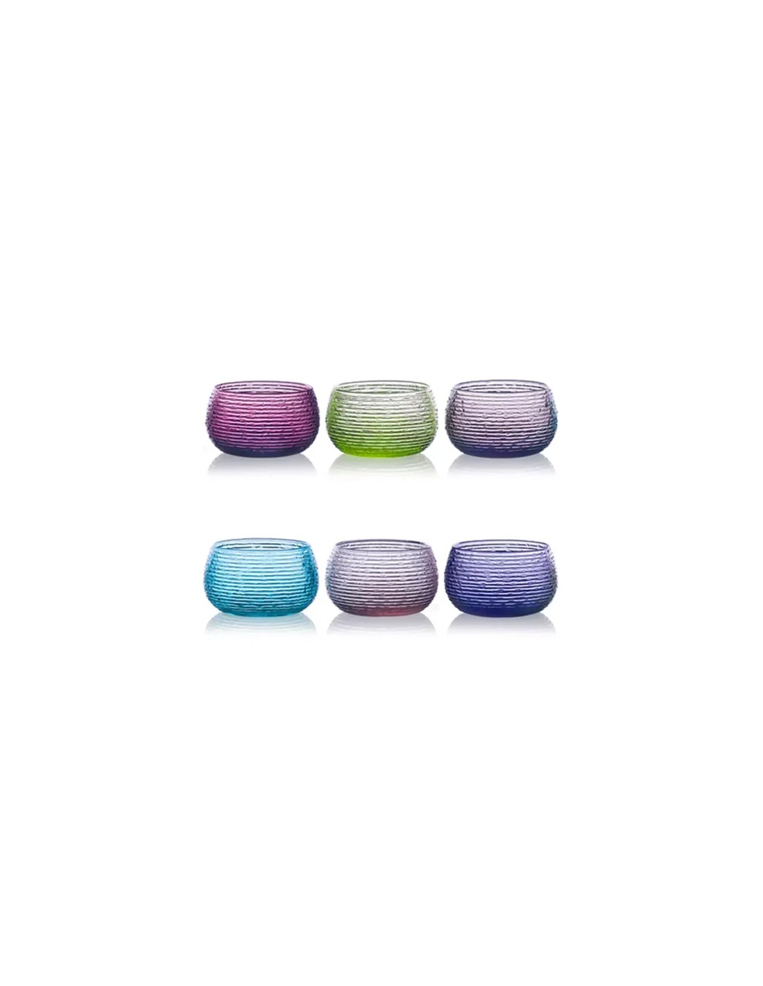 Coppette Multicolor set da 6 in vetro soffiato colorato nella massa: li caratterizza la lavorazione a righe orizzontali e la forma semi-sferica; eleganti ma anche da utilizzare sulla tavola di tutti i giorni.