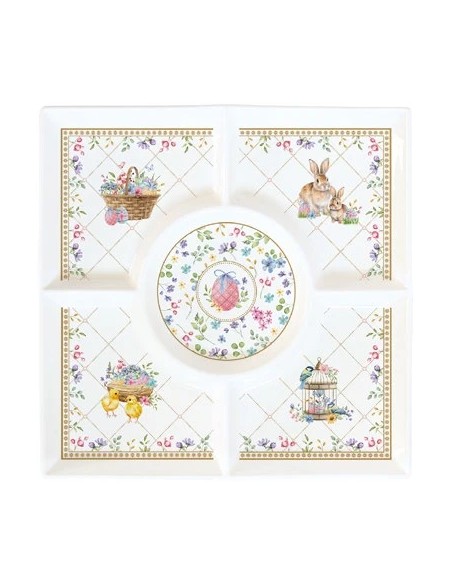 Vassoio aperitivi della collezione Spring Bloom, in fine porcellana, decorato con una cornice di fiori provenzale sui bordi e teneri conigli tra ceste e gabbiette.