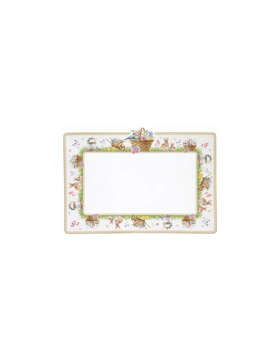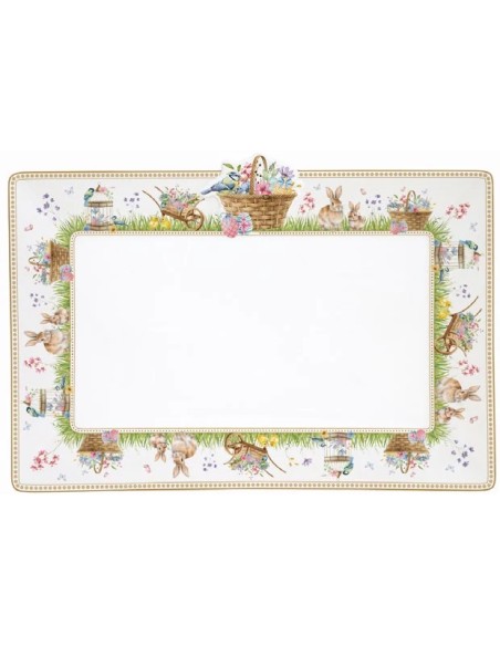 Vassoio in fine porcellana della collezione Spring Bloom , in fine porcellana , decorato con una cornice di fiori e coniglietti in tonalità pastello