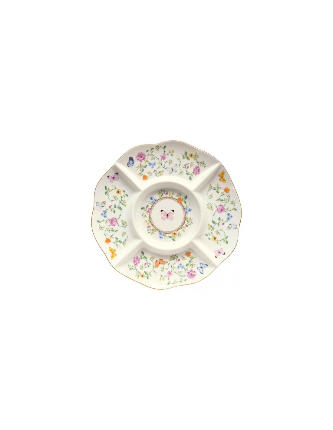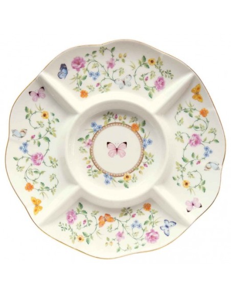 Piatto aperitivo in finissima porcellana della collezione Dancing Butterflies, in colour box : un decoro fatto di fiori e farfalle dai colori tenui e per completare un giro in oro, che lo rende unico e raffinato.