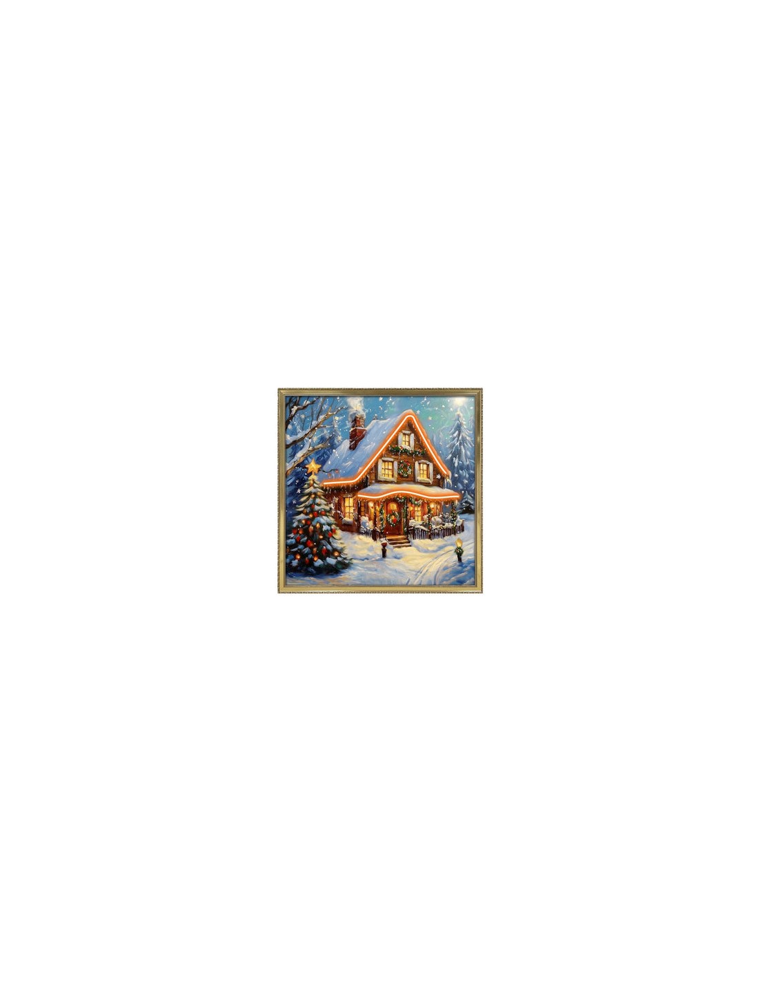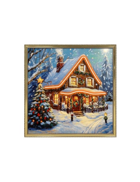 Quadro scena Natale su tela e luce Led( doppia alimentazione a batteria e cavo USB): una scena di Natale da sogno, una casa addobbata che nasconde tutto il calore e i colori della festa.