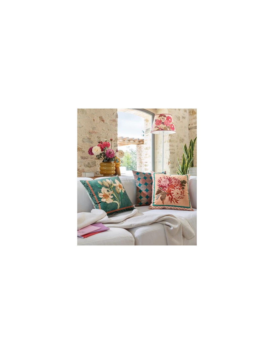 Lampada completa di base in metallo e paralume conico piccolo "Camelia": una lampada con decoro dai colori intensi, ma raffinati, per rendere speciale ogni angolo della tua casa.