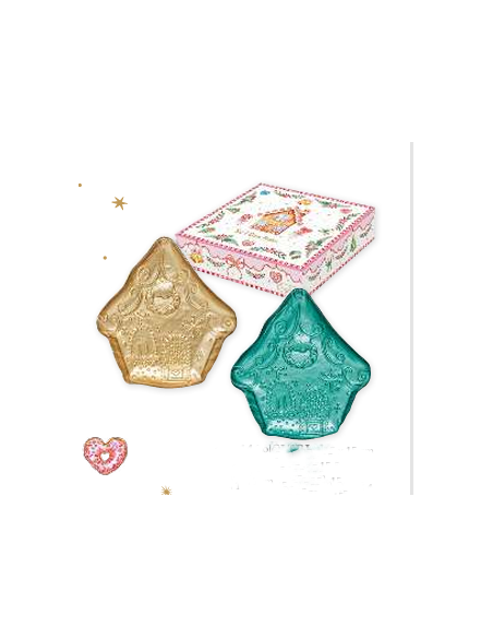 Set 2 piattini in vetro, a forma di casetta della collezione Sweet Christmas, in blu e oro e colour box: ideali per la tavola della colazione o per offrire il tè o la merenda alle amiche.