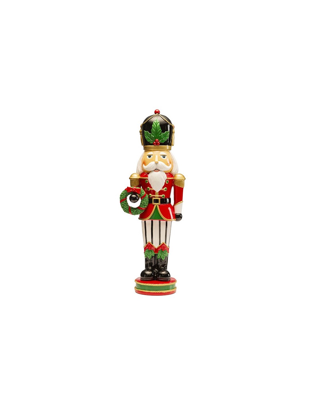 Schiaccianoci gigante con ghirlanda ,alto 45,5 cm , in resina: colori vivaci, rifinito nei particolari e con dettagli in oro. Lo schiaccianoci è entrato a far parte della nostra tradizione natalizia, diventando un oggetto decorativo elegante e raffinato, da collocare in un ingresso o in qualsiasi angolo della tua casa .