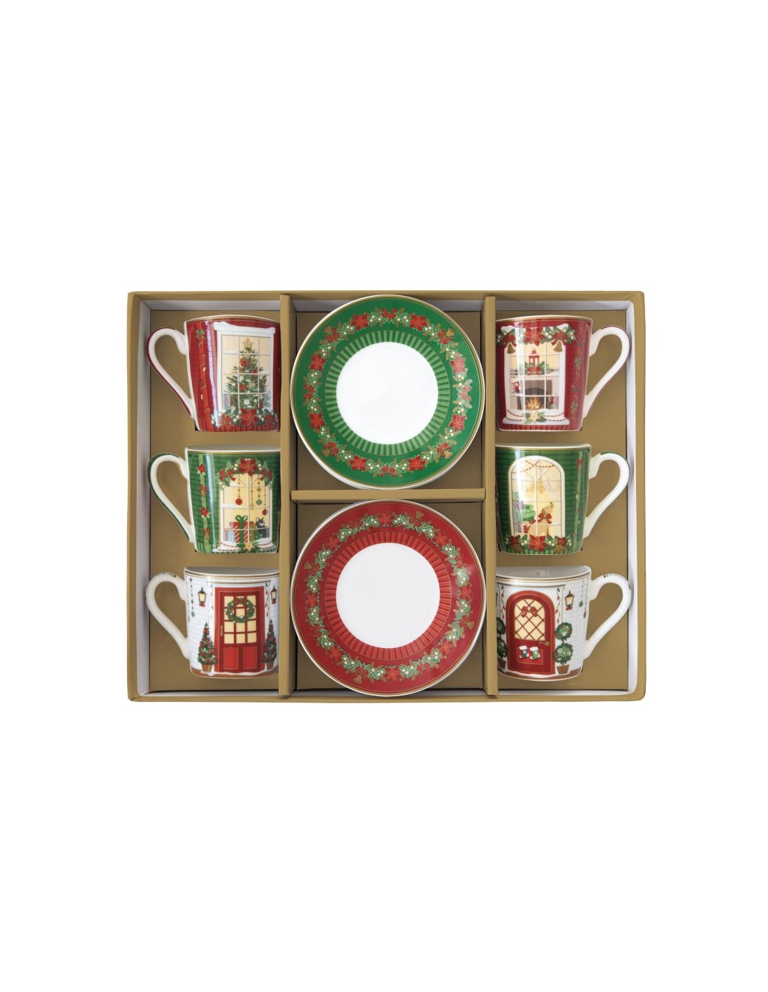 Tazzine set da 6 in finissima porcellana della collezione Festive Avenue, con piattino e in gift box: un design davvero originale ,come ci spiega il nome della collezione, viale in festa. Ogni tazzina è una casa addobbata, di un lungo viale.