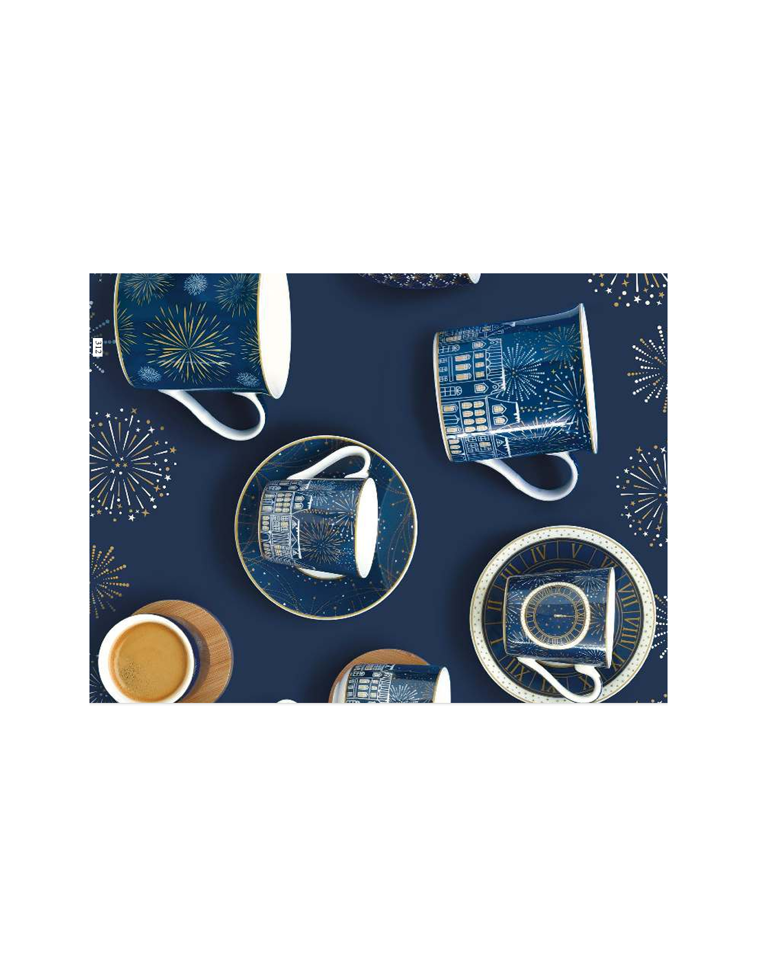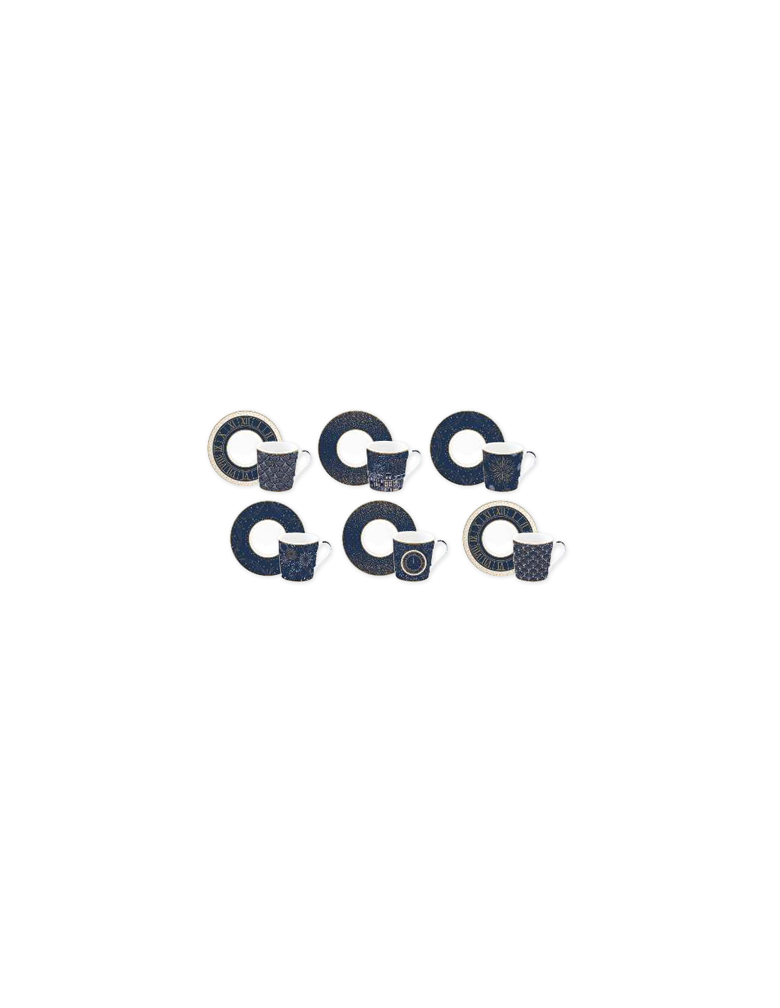 Tazzine set da 6 in finissima porcellana, della collezione Midnight, con piattino e in gift box: un design raffinato e originale, su ogni tazzina il blu della notte illuminato dalle luci natalizie e sullo sfondo case o lampi di luci.