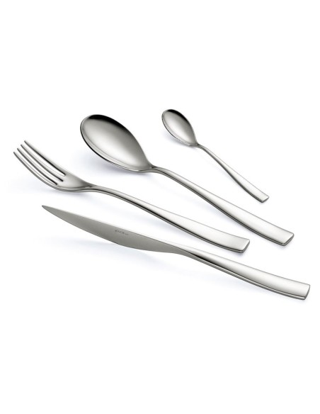 Posate Etoile 30 pezzi EME, in acciaio inox 18/10,finitura lucida, dalla linea moderna, morbida e decisa. La sua originalità consiste nell'appoggio a taglio del coltello, dalla rotondità del cucchiaio e dalla sinuosità della forchetta