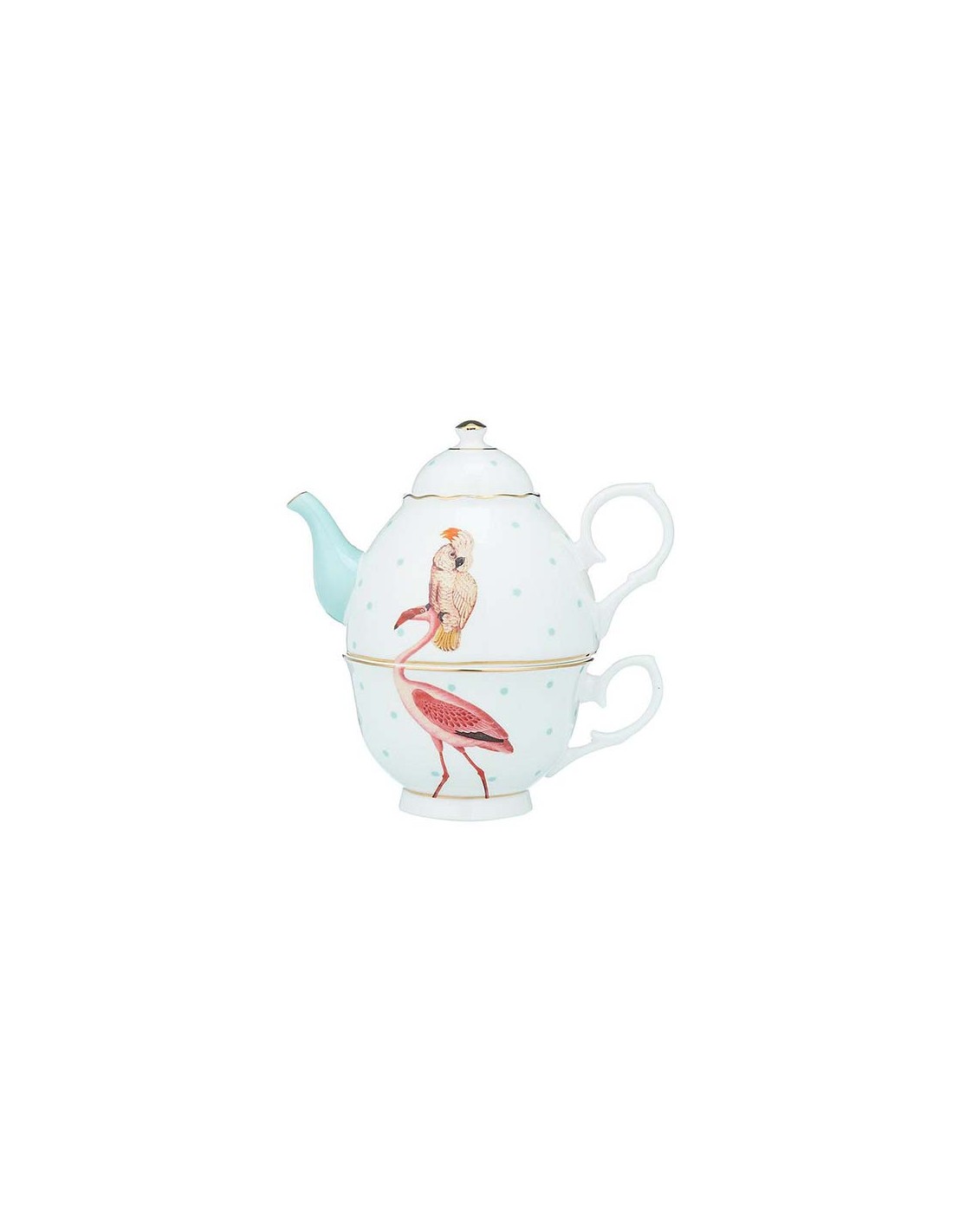 Tea for one firmata Yvonne Ellen, in finissima porcellana Bone China, composta da teiera , tazza con piattino. Il design si ispira sempre al mondo esotico, pappagallo e fenicottero in colori tenui su fondo bianco, con pois celesti, dettagli in oro.