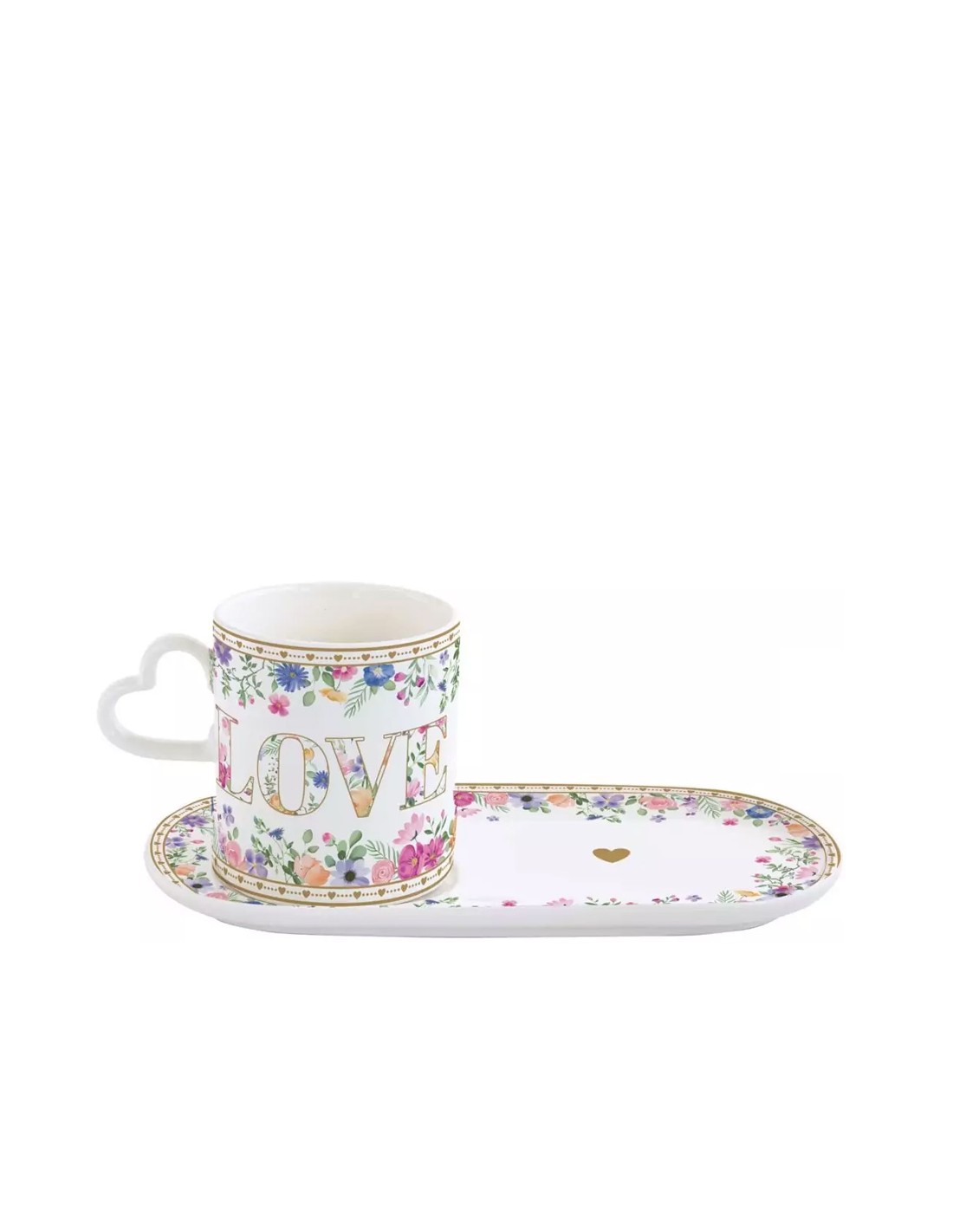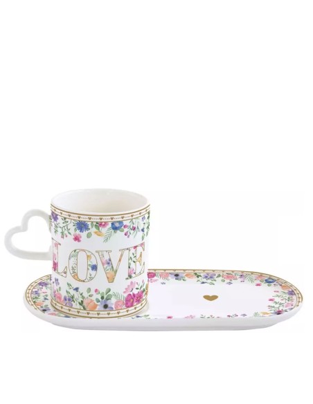 Mug con piattino, in finissima porcellana della collezione Mon amour, con manico a forma di cuore e colour box: un design raffinato, ghirlande di fiori dai colori pastello con dettgali in oro.